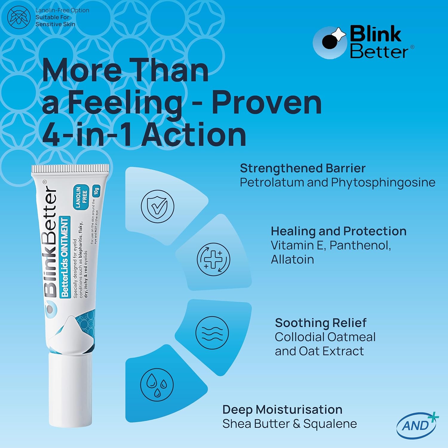 Discover gentle, effective relief for dry, sensitive eyelids with the BlinkBetter Lanolin-Free Eyelid Care Bundle, thoughtfully designed for those seeking clean, irritation-free eye care. This duo includes: Lanolin-Free Eyelid Ointment (10g) – A rich, deeply moisturizing ointment formulated without lanolin, ideal for individuals with sensitive or allergy-prone skin. It helps soothe dryness, flaking, redness, and discomfort around the eyes. Enriched with skin-nourishing ingredients, it supports the natural moisture barrier and promotes soft, healthy skin. Tea Tree Oil Eyelid Wipes (20 Count) – These biodegradable, dual-textured wipes gently cleanse the eyelid area while delivering a soothing blend of tea tree oil, chamomile, and aloe vera. They effectively remove debris, oil, and makeup while calming irritated skin—perfect for blepharitis, MGD, and dry eye sufferers. Together, these products form a complete daily care routine: cleanse with the wipes, then hydrate and protect with the ointment. Safe for daily use and approved by eye care professionals, this bundle offers comfort you can count on—without harsh ingredients. If you're managing dry, flaky, red, or sensitive eyelids, this bundle provides the soothing, lanolin-free care your eyes deserve.