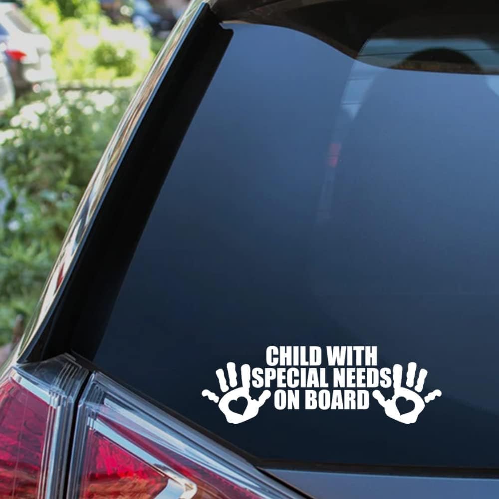 Promote understanding and safety on the road with this meaningful decal designed for families of children with special needs. The bold white text "CHILD WITH SPECIAL NEEDS ON BOARD" is clearly printed against a stark black background, accompanied by symbolic handprints with heart-shaped cutouts on both sides. This visually striking sticker helps communicate gently yet effectively to other drivers, encouraging patience and caution. Crafted from premium vinyl, it is waterproof, UV-resistant, and built to withstand harsh weather conditions without fading or peeling. Easily adheres to any smooth surface like car windows, bumpers, or notebooks. A simple yet powerful way to raise awareness and show love for your child.