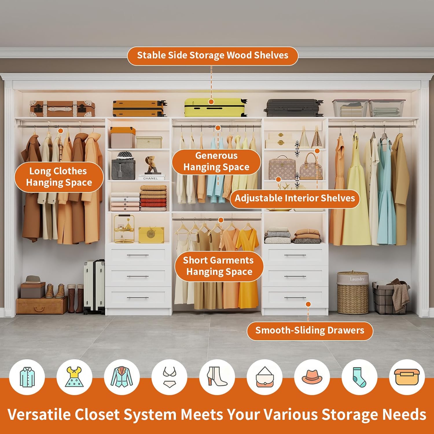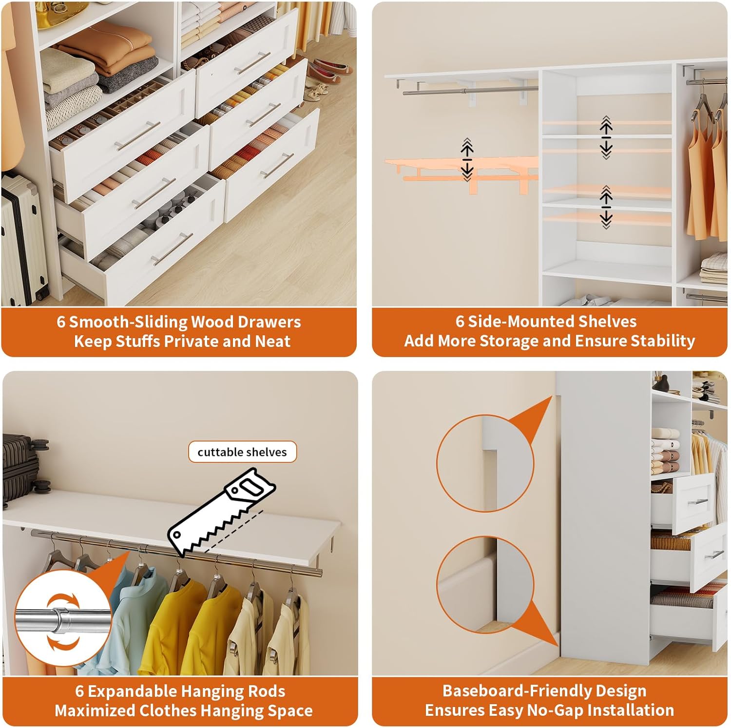 | Included Components | 6 stainless steel hanging rods, clear and straightforward manual installation instructions, wood closet organizer system with interior adjustable shelves and 6 cuttable side-mounted shelves |