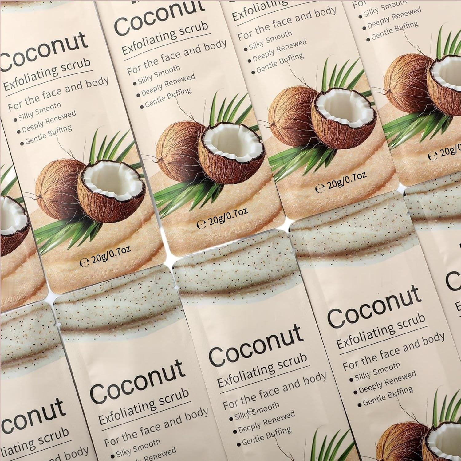 Enjoy a tropical and gentle exfoliation experience with this Coconut Sugar Body Scrub Gift Set, designed for convenient and comfortable body care. Each set includes 20 individually wrapped 20g packets, offering an upgraded travel-size portion that is easy to use at home, while traveling, or during spa-inspired routines. The fine sugar crystals combined with nourishing plant oils provide a smooth, moisturizing feel, while the coconut fragrance adds a refreshing, tropical touch. With its hygienic single-use packaging and bulk-style gift set, this coconut sugar scrub is ideal for gifting, sharing, or discovering a new body care routine without waste or commitment.