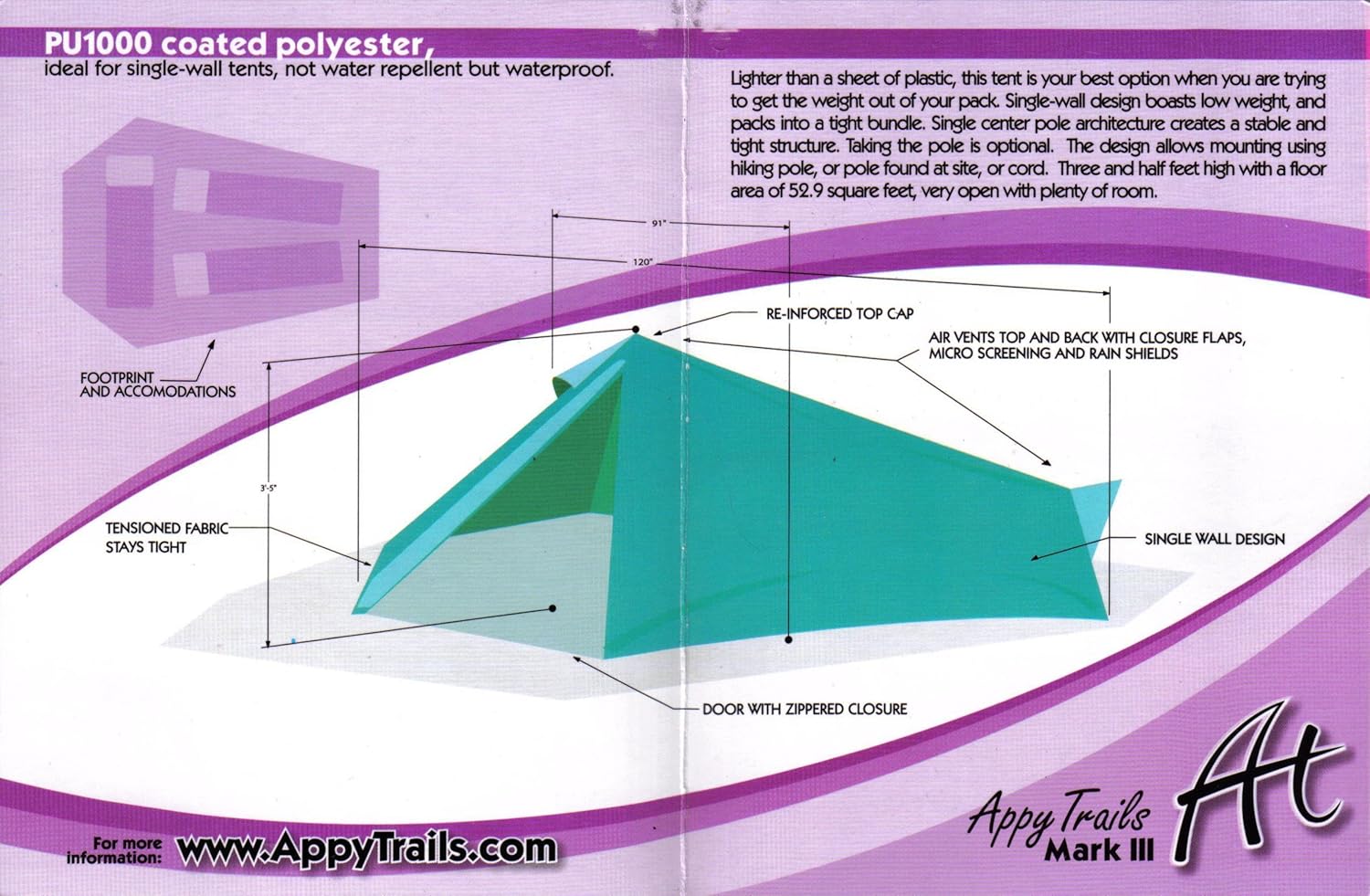 Specifications: Sleeping capacity: 3 (see chart - this model requires setup with rope in order to sleep 3, otherwise 2 with equipment) Average minimum weight: 1 lbs. 2.7 oz. Weight with stuffsack: 1 lbs. 3.3 oz. Weight of stakes and stuffsack: 3.2 oz. Weight of pole set: 4.4 oz. Floor area: 52.9 square feet Floor dimensions: 91 by 120 inches Height: 3.5feet Vestibule area: included Floor fabric: none; requires groundcloth Pole material: Aluminum Pole: Three section pole, plus rear tensioning rod. Packed size: 4.75 x 6.5 inches Fire resistant to CAPI-84 standards