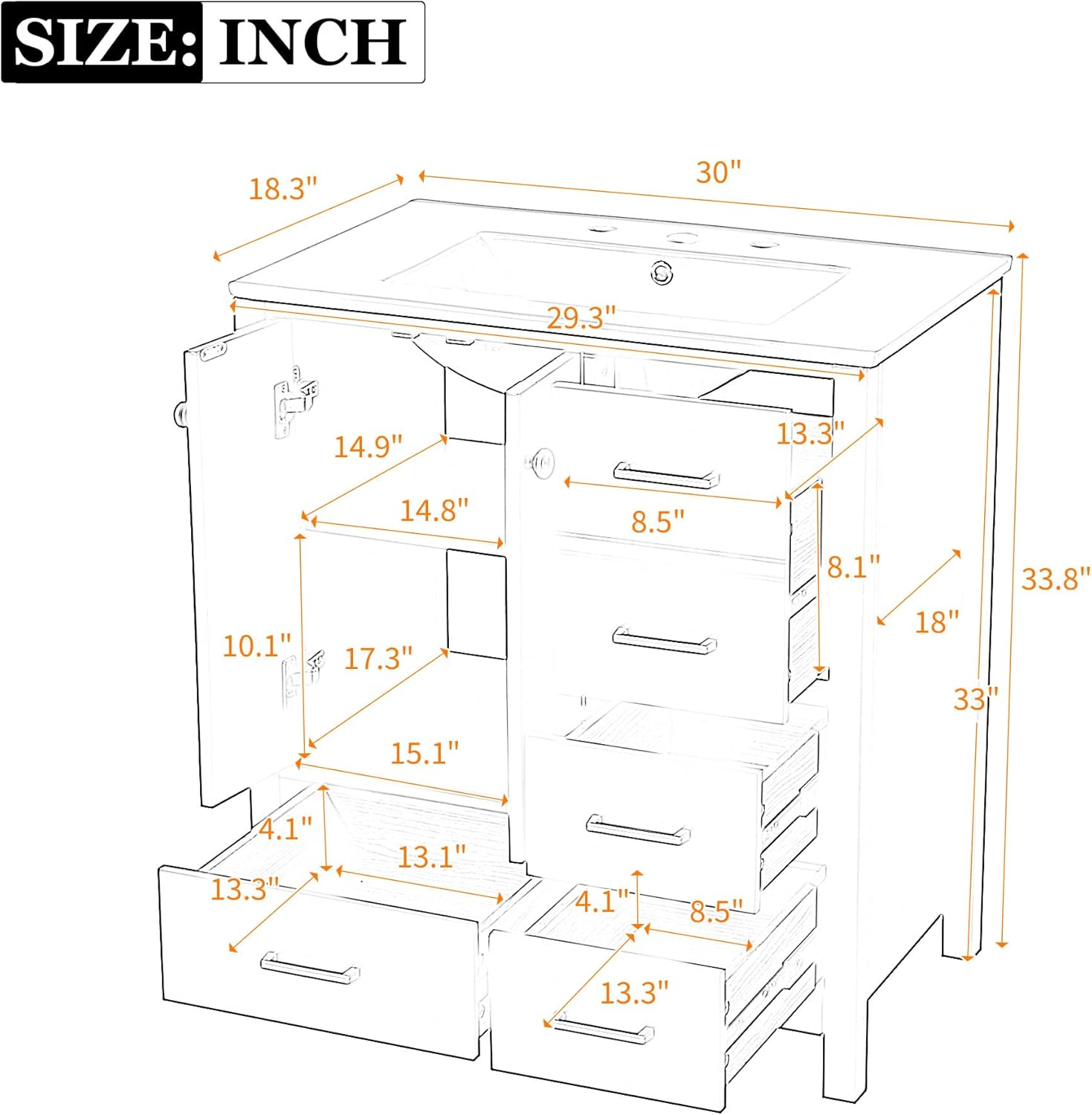 Description: Dimension & Weight Dimension of Overrall Product:30'' * 18.3'' * 33.8'' Dimension of Storage Cabinet:29.3'' * 18.03'' * 33'' Dimension of Basin Sink:30'' * 18'' * 6.25'' Inner Length and Inner Width of The Basin Sink:23'' * 13.2'' Weight of Overroll Product:104.72 lbs Product Dimensions: Assembled Length (in.):30.00 Assembled Width (in.):18.30 Assembled Height (in.):33.80 Weight (lbs.):104.72 Package Size: Length (in.):36.80 Width (in.):23.10 Height (in.):20.10 Weight (lbs.):120.15 About This Item: Functional Keywords 1.Solid Wood Frame 2.Soft-Closing Hinges 3.High Quality MDF Boards 4.Smooth Drawer Slide 5.Ample Storage Space 6.4 Full-extension Drawers Appearance Keywords 1.Retro Style 2. Exquisite Metal Handle 3.Unique Groove Pattern