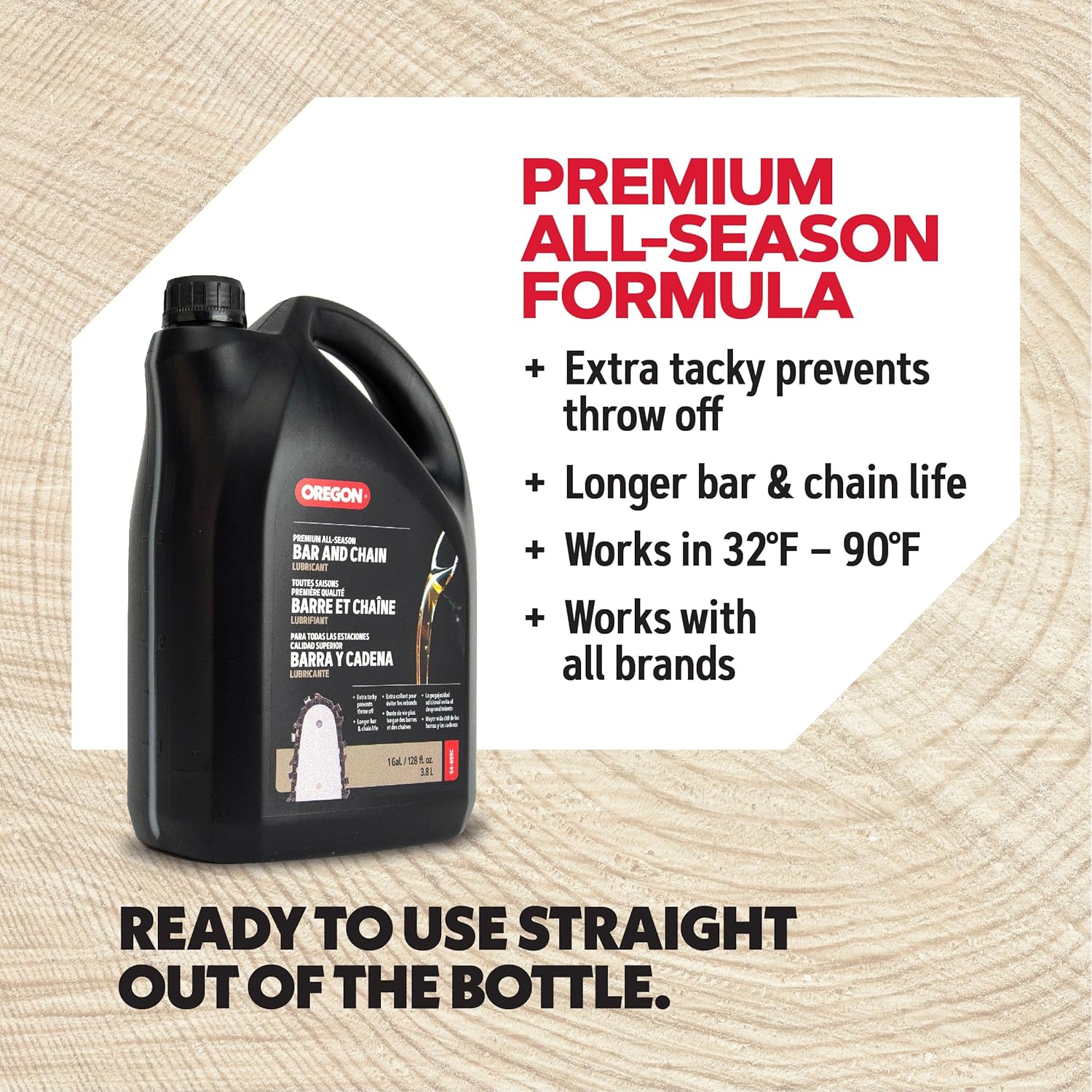Oregon premium, all-season Bar and Chain Lubricant is specially compounded to provide extra tackiness and prevent "throw off," even under adverse weather conditions. Provides maximum engine power, low friction, and faster cutting time. High film-strength prevents wear or scuffing of chain links and bars while protecting metal parts against corrosion and rust. Resists build-up of deposits such as pitch, sap or gum.