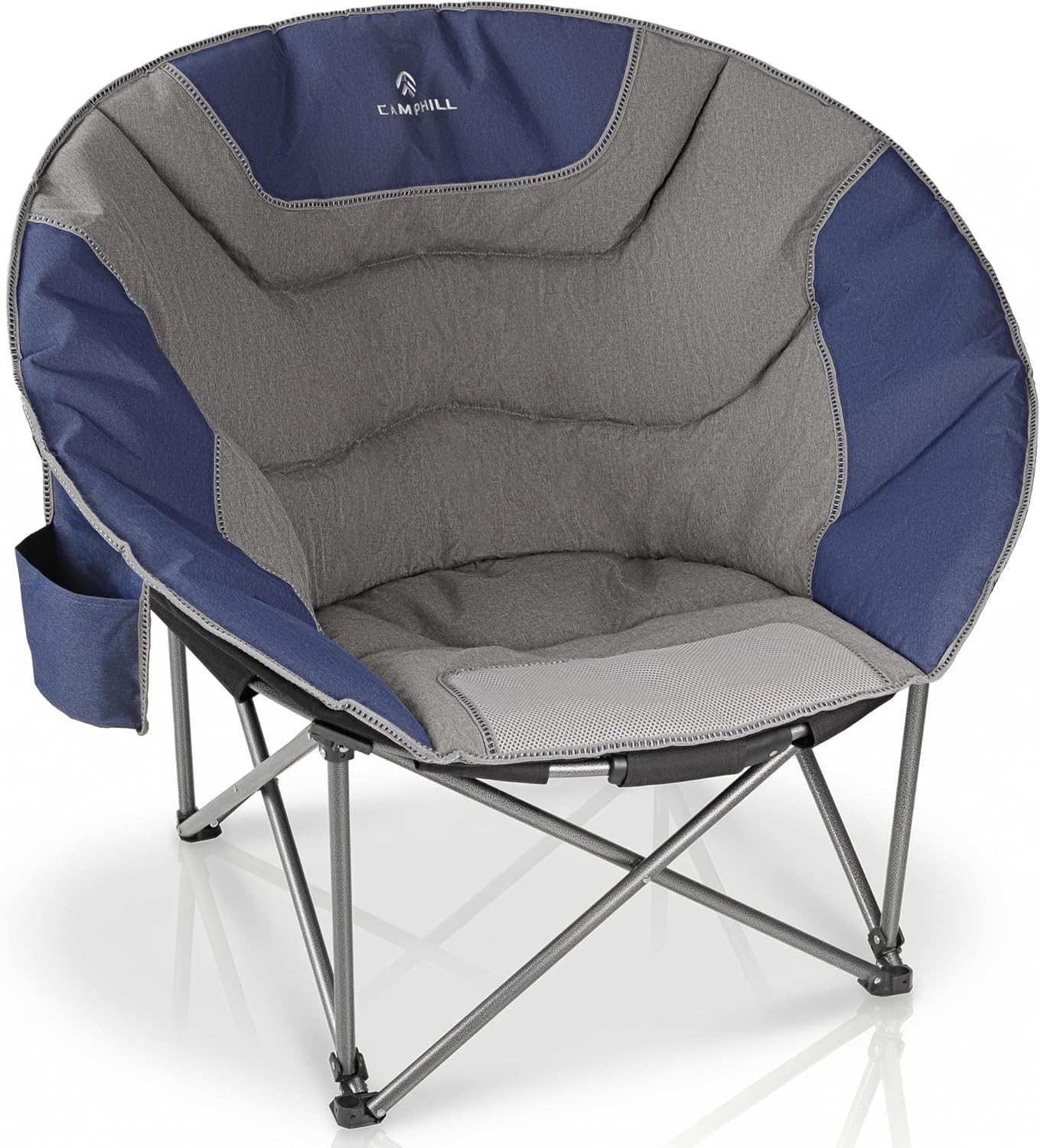 Sink into cloud-like comfort with our Oversized Camping Moon Chair.This 500 lbs capacity folding chair features a plush padded round seat,sturdy steel frame,and handy side pocket for essentials. Perfect for camping, picnics, backyard lounging or indoor relaxation. Folds quick, carries easy.