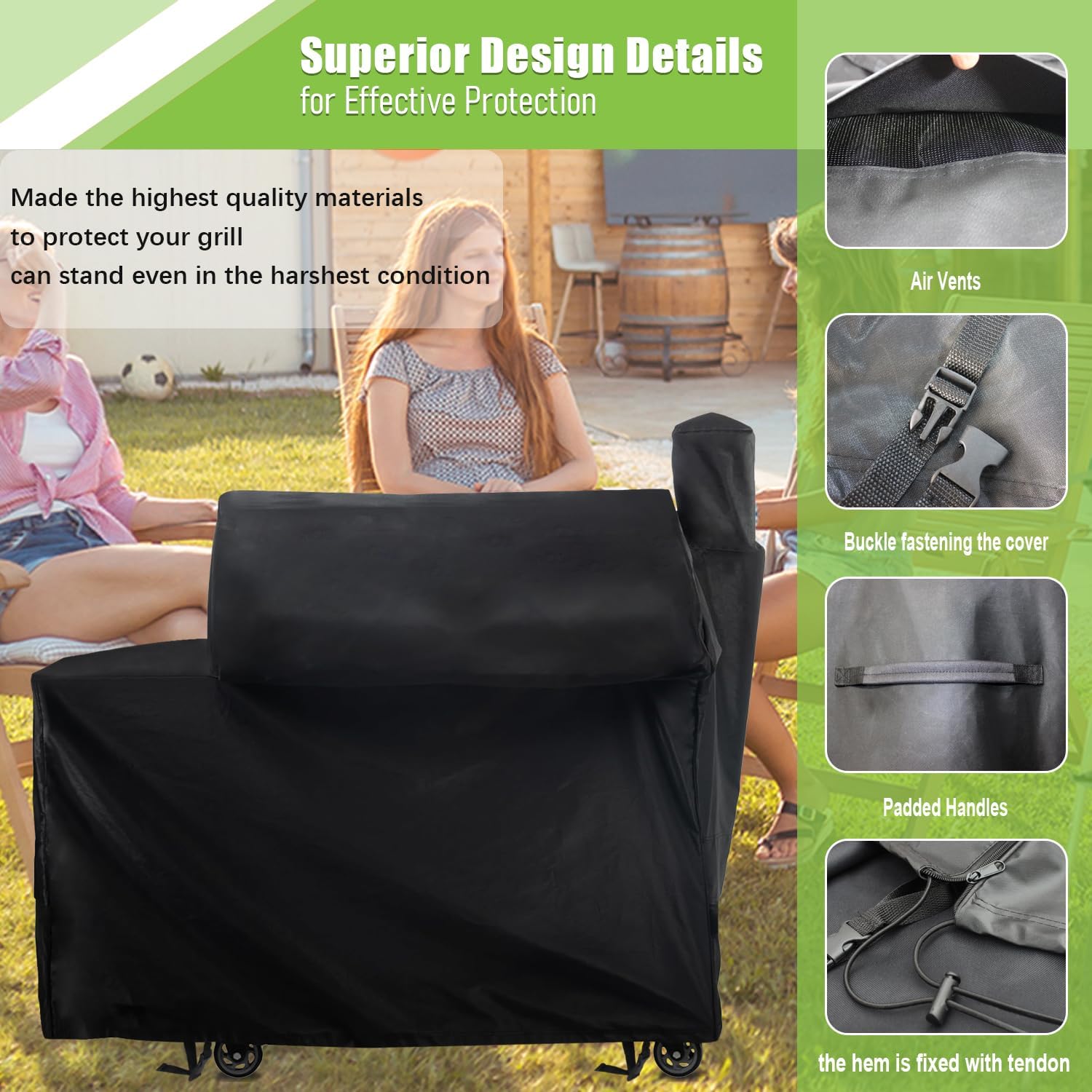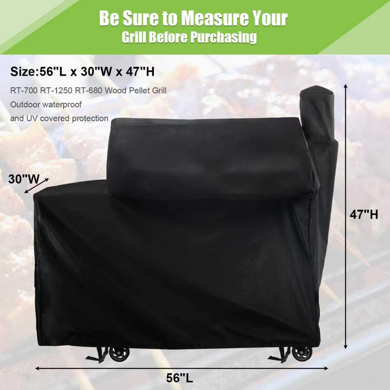 Grill Cover Size: 56"L x 30"W x 47"H Replacement for RT-700 RT-1250 RT-680 Wood Pellet Grill and similar pellet grill with chimney Material: 600D heavy duty polyester coated PVC, waterproof, dust-proof, 100% solution-dyed, superior-strength fabric. Effectively shielding your grill from water, snow, hail, rain, and wind, this well-made cover ensures powerful protection. Function : There are four premium buckles for a secure fit ,preventing the cover from blowing off in strong winds. The addition of two durable handles on the side, help to easy covering and uncovering. The 600 cover is designed with a superior textile process, improving abrasive resistance, rip resistance, and strength. Advantage: Unique zipper design: The side of the grill cover is equipped with a unique zipper design, making it easier for you to place it on the grill rack and convenient to use Easy to Clean: Water repellent finish enables stain-preventing and easy cleaning, simply hosing with water and the dirt will come off easily