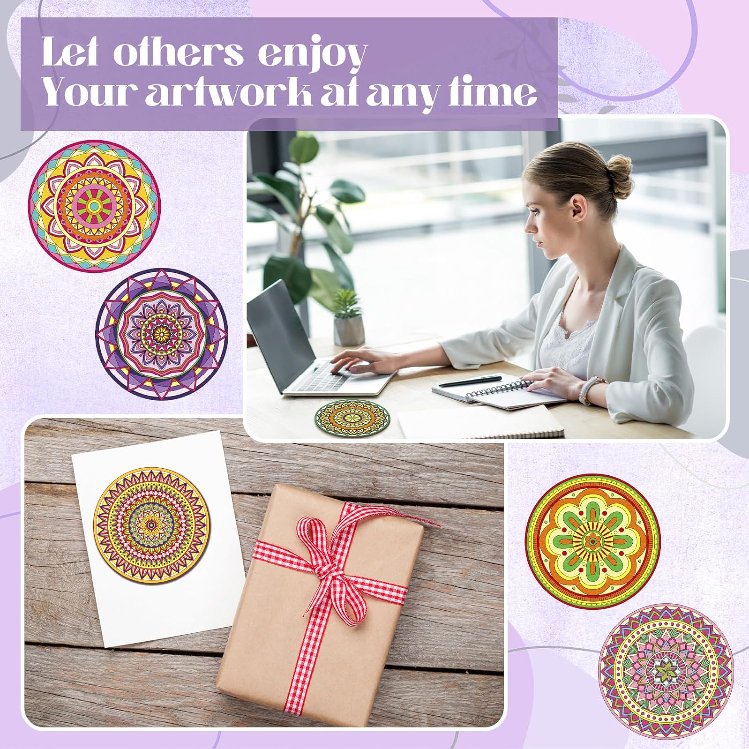 Features: Relaxing mindfulness activity: The mandala patterns guide users into a calming creative flow, encouraging stress relief through slow, rhythmic coloring and layering. This kit supports both beginners and experienced hobbyists looking for a relaxing indoor art project that encourages focus and creativity. Versatile Application: These wooden coasters for crafts are vibrant and versatile, will blend in with any type of table setting, ideal for end tables, coffee tables, or desks, able to hold coffee cups, wine glasses, mugs, drinks, etc., can be applied in most places and events, such as home, office, parties, bars, restaurants, beaches, a charming yet functional addition to any space. Specifications: Color: multi-color Material: main wood Size: 4 inches Package includes: 20 x Unfinished mandala coaster 36 x Markers 20 x Non-Slip mats 1 x Coaster storage base Notes: Manual measurement, please allow slight errors on size. The color may exist slight difference due to different screen display